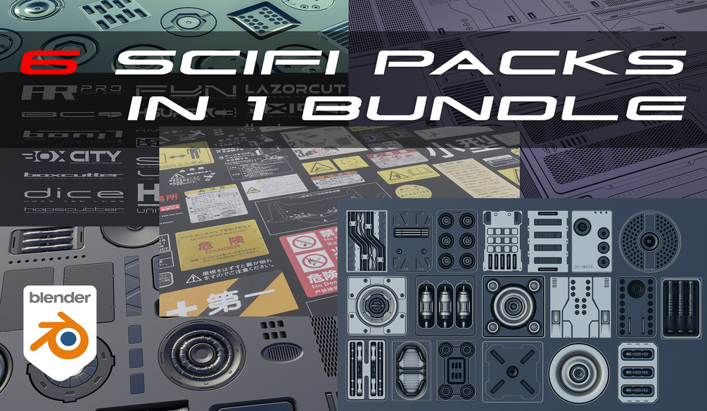 This bundle includes 440+ high quality decals (260 Japanese info decals created from real images with translations, so you will always know what the decals mean, as well as 80 SciFi panels for quick SciFi environment creation, and other scifi decal packs.